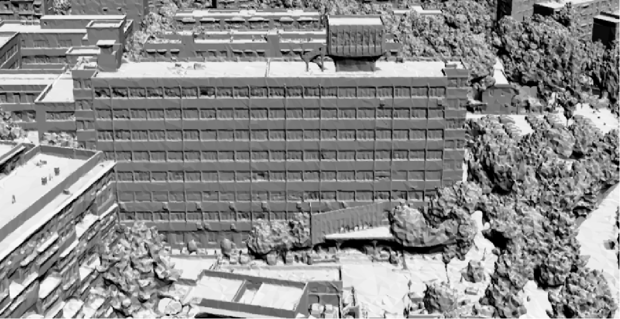 最后,將彩色點(diǎn)云的彩色屬性根據(jù)點(diǎn)云的空間位置映射到白模表面,這樣就制作完成既有幾何外觀又有真實(shí)彩色紋理的實(shí)景三維模型。