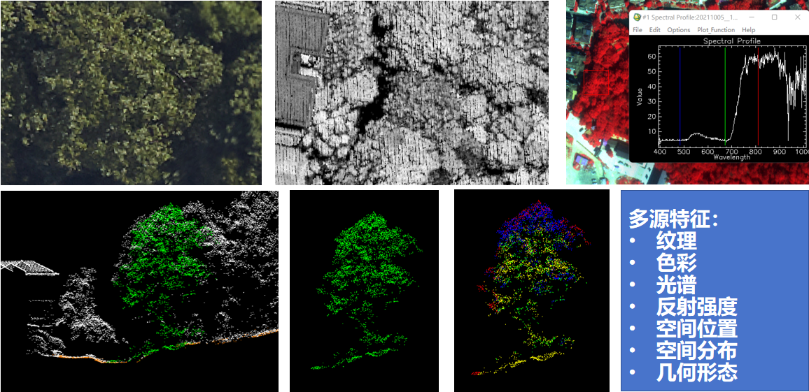 在智慧林業(yè)孿生建設(shè)中,基于飛燕遙感多模態(tài)數(shù)據(jù),時(shí)空同步的高光譜影像、激光點(diǎn)云結(jié)合少量的地面或街景影像,即可自動(dòng)化、大范圍快速生成單體化樹木三維模型場(chǎng)景。激光點(diǎn)云提供幾何信息,高光譜影像進(jìn)行樹種識(shí)別,通過實(shí)測(cè)樣本庫自動(dòng)匹配樹種三維模型,從而達(dá)成樹木模型的批量構(gòu)建,并具備測(cè)繪學(xué)意義上的幾何與屬性精度。