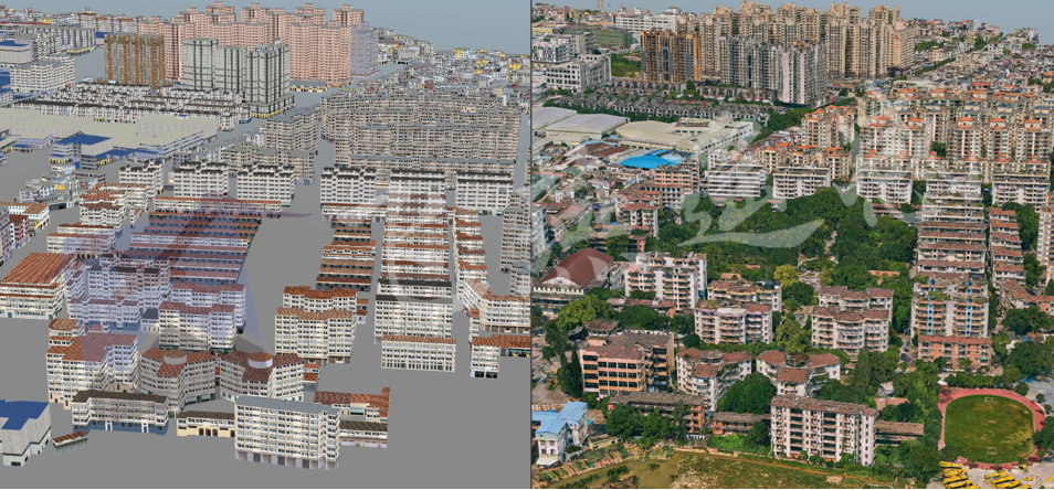 在LOD1.3模型建設(shè)中,充分利用多模態(tài)數(shù)據(jù)優(yōu)勢,在簡化和輕量化的基礎(chǔ)上進(jìn)一步提升建筑物模型紋理的真實(shí)性和城市樹木建模的豐富度。利用激光點(diǎn)云輔助生成高精度建筑物模型,利用傾斜影像映射參考紋理,通過對紋理分析、簡化,讓模型表達(dá)更加真實(shí)。